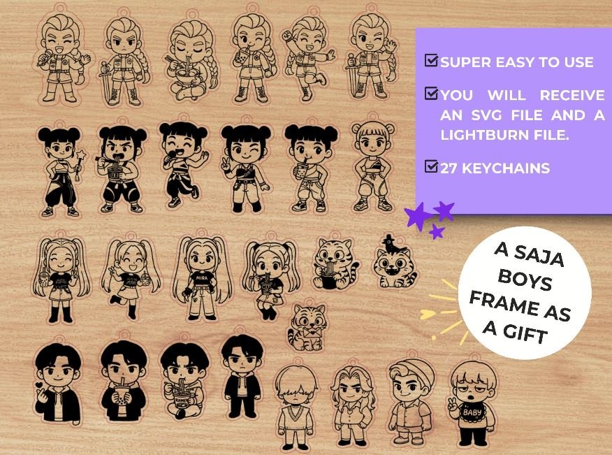 ¡Da vida a tus ideas y crea tus propios llaveros Kpop Demon Hunters con este archivo digital de corte láser! 🎶⚡ He diseñado 27 Llaveros de Kpop Demon Hunters pensando en fans del Kpop, creadores y makers que buscan un diseño llamativo, versátil y listo para usar. Con estos archivos podrás fabricar llaveros únicos y llenos de personalidad, perfectos para destacar en cualquier proyecto creativo.