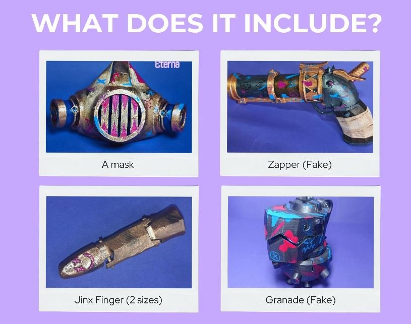 ¡Prepárate para destacar! Descubre mi set exclusivo de accesorios para cosplay de Jinx, una pieza única que no encontrarás en ningún otro sitio. Incluye máscara, dedo, zapper (falso) y granada (falsa), creados para que tu cosplay se vea espectacular y fiel al personaje.