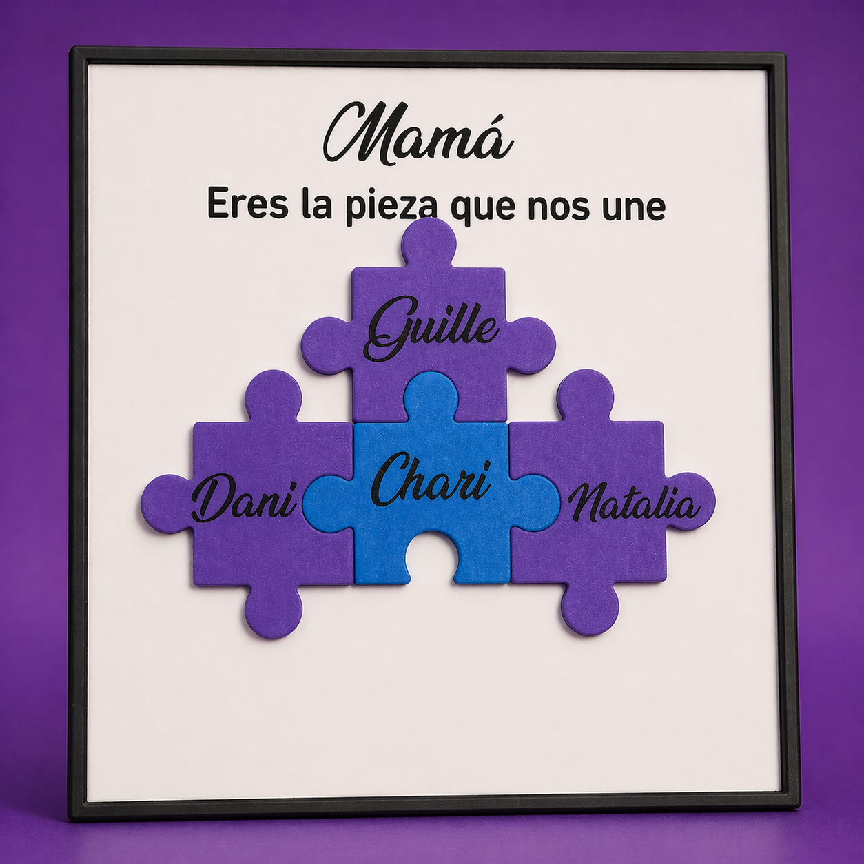 Cuadro decorativo en forma de puzzle personalizado con nombres y colores a elegir. Un regalo único y emotivo para mamá, perfecto para el Día de la Madre.