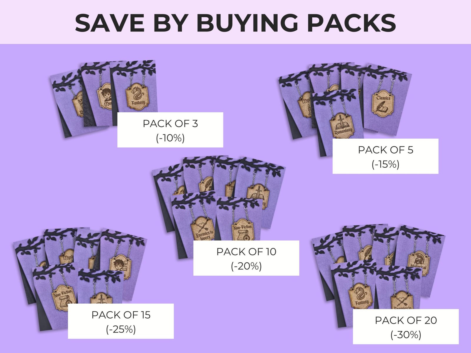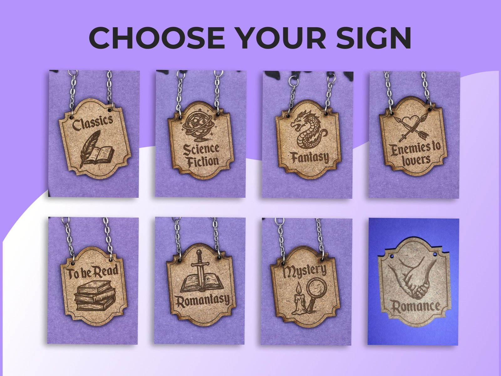 Con más de 15 diseños diferentes para elegir y la opción de comprarlos en pack para ahorrar, estos letreros son ideales tanto para ti como para regalar a un amante de la lectura. Puedes escoger el idioma que prefieras, inglés o español, para que se adapten a tu estilo o al de la persona que reciba el regalo.