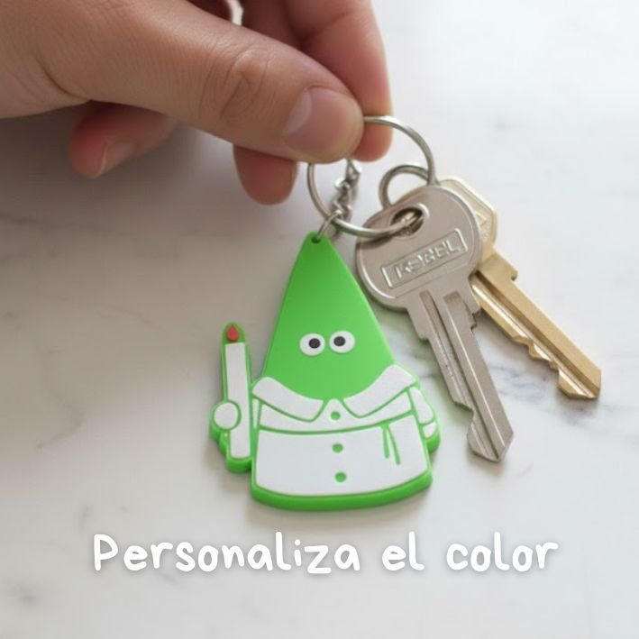 Está fabricado en material PLA y resistente, pensado para el uso diario. Incluye cadena metálica y anilla para poder colocarlo cómodamente donde prefieras. Su tamaño compacto lo hace ligero y práctico, ideal para acompañarte en el día a día sin ocupar espacio.