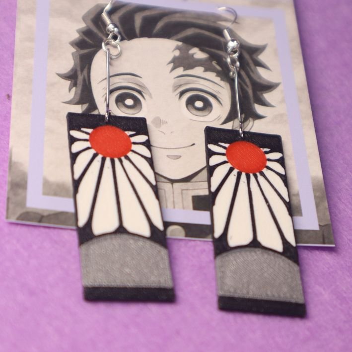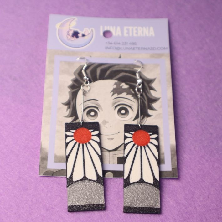 Fabricados mediante impresión 3D, estos pendientes destacan por su acabado detallado y sus colores característicos, manteniendo la esencia de los pendientes tradicionales de Tanjiro en un formato más compacto y ligero.