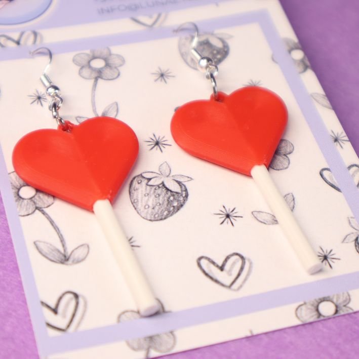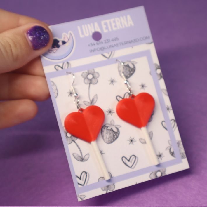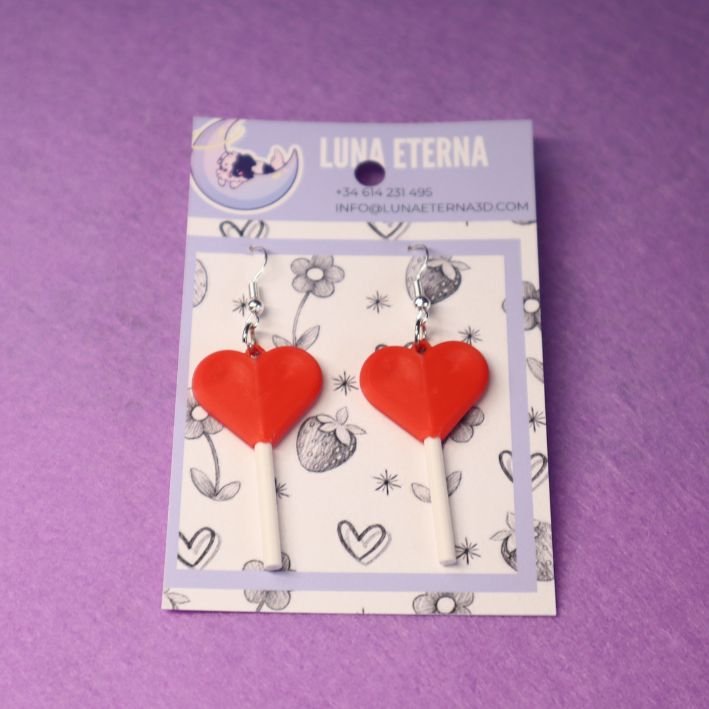 Fabricados mediante impresión 3D, estos pendientes destacan por su acabado limpio y sus colores vibrantes, combinando el rojo intenso del corazón con el detalle del palo para un efecto visual encantador. Su diseño ligero los hace ideales para llevar durante todo el día con total comodidad.