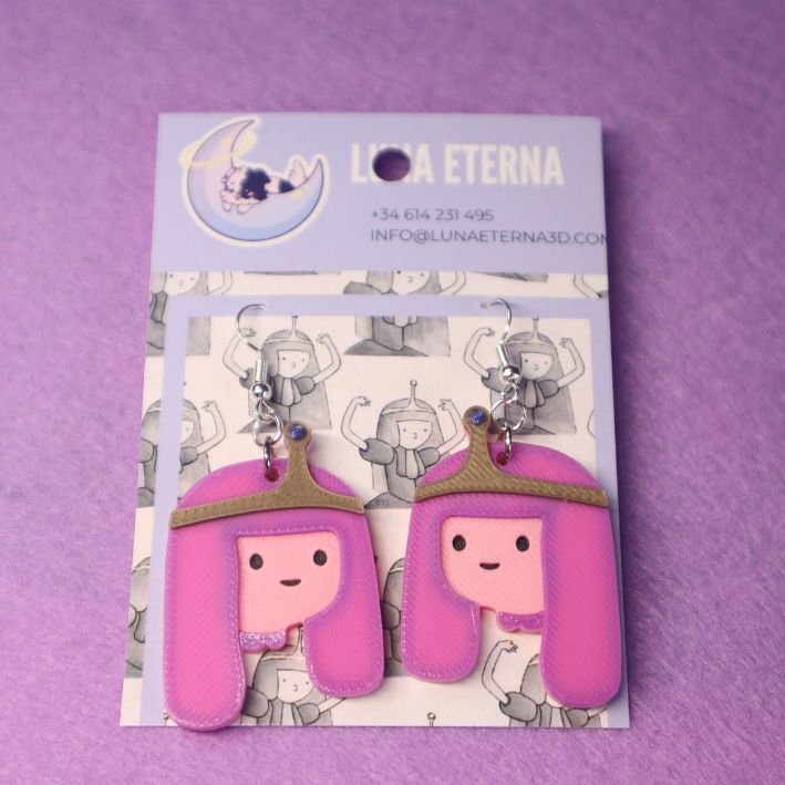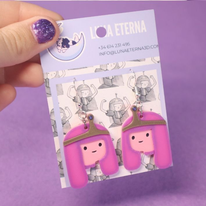 Fabricados mediante impresión 3D, estos pendientes destacan por sus tonos rosados y su acabado suave, con detalles que representan fielmente el característico look de la Princesa. Su diseño ligero los hace ideales para llevar durante todo el día sin molestias.