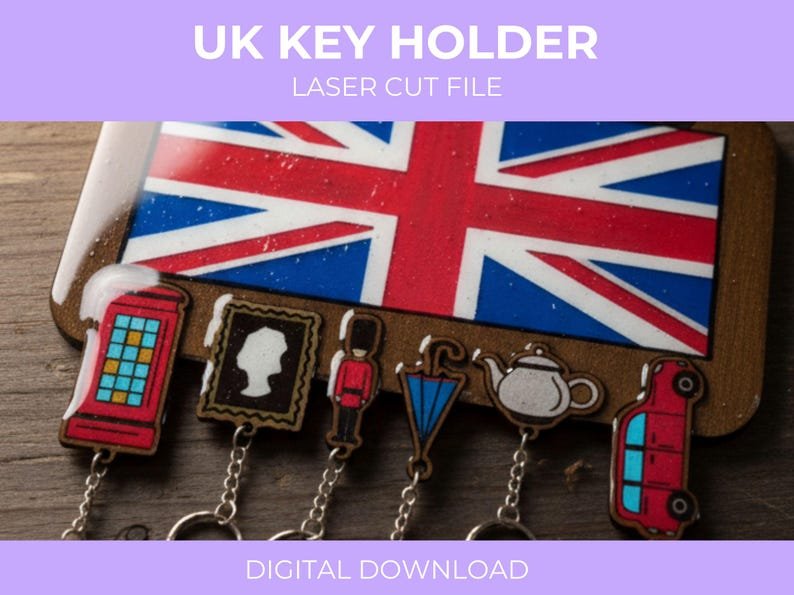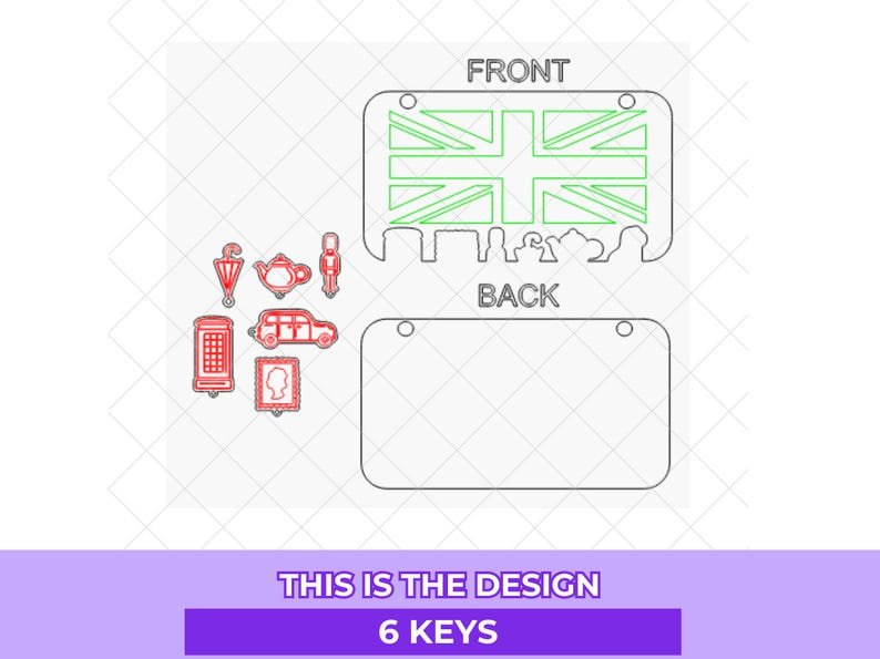 Crea tu propio portallaves de Reino Unido de 6 llaveros con este archivo digital de corte láser 🎶⚡. Incluye formatos .SVG, AI. y .LBRN listos para usar en máquinas de grabado y corte. Perfecto para trabajar en acrílico, madera, MDF y metacrilato.