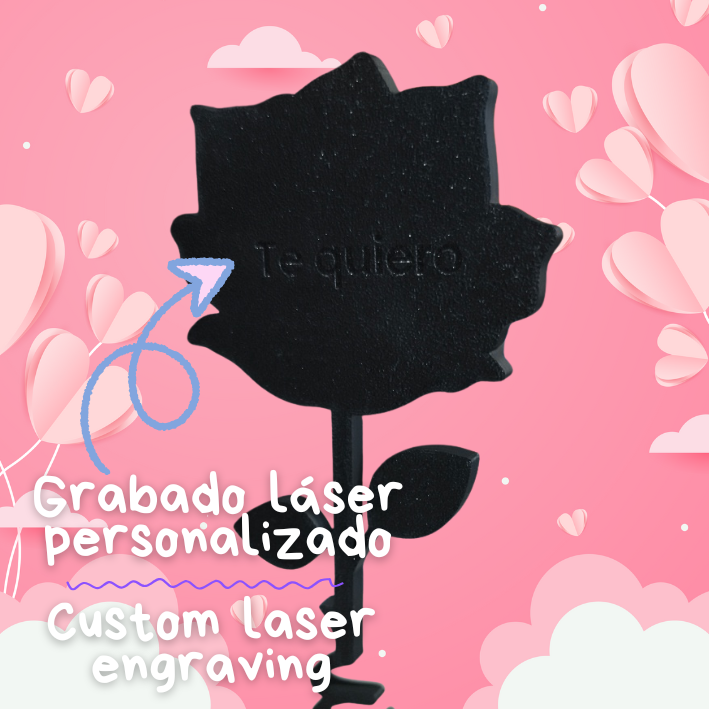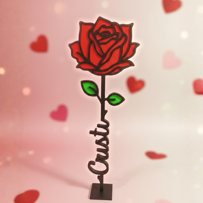La rosa está cuidadosamente elaborada mediante impresión 3D de alta precisión, logrando un acabado elegante y moderno. En el tallo se personaliza el nombre de esa persona especial, integrado directamente en el diseño, lo que le da un toque exclusivo y totalmente único. Cada pieza se fabrica bajo pedido, asegurando que el resultado final sea tan especial como el mensaje que deseas transmitir.